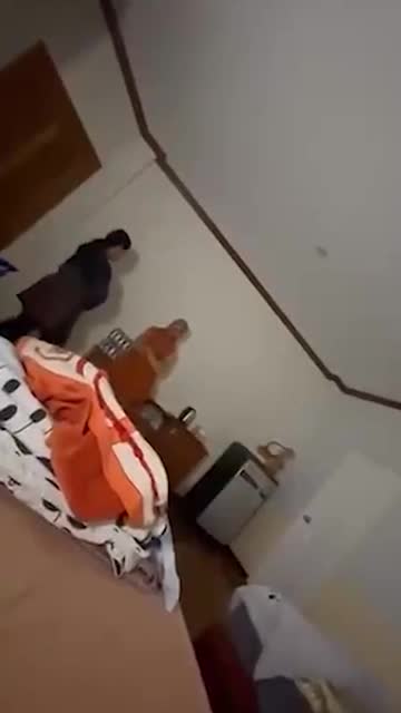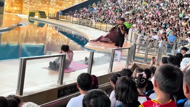 Footage shows the enthusiastic man performing crunches while a female staff member guides the tusker off to the side of the stage in Guangdong, China. 2025-07-17 20:41:31