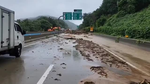 Footage captured by Joey shows mud and debris covering the road, as emergency crews and heavy machinery work to clear the scene in Dangjin, South Chungcheong Province, on July 17. 2025-07-17 17:46:16