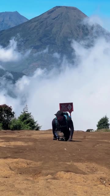 Footage shows Mohammad Hikmat, dressed in black long sleeves and a cap, carefully making his way up the peak in the Dieng Plateau, Central Java, on July 11. 2025-07-17 20:31:55