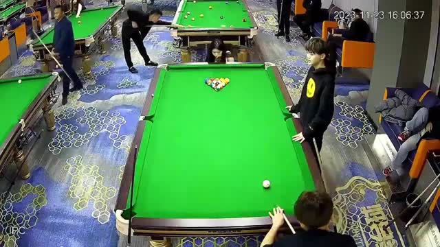 Dramatic CCTV footage shows the female hostess in a white dress arranging the balls in the rack when the cue ball, played on a nearby table, bounced off and hit her back in Jiangsu, China. 2025-07-16 21:03:15