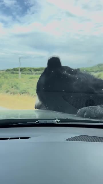 Footage captured by Angelique Szy shows the black bruin leaning against the side of the black vehicle at Reserve Africaine de Sigean in Aude, France. 2025-07-16 21:40:51