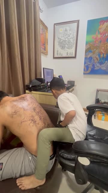Compilation footage shows the eight-year-old kid Nong Night using the machine to add ink to the man's skin in Chonburi province, Thailand. 2025-06-11 03:15:00