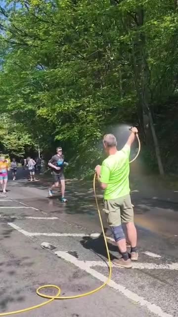 Footage shows the man standing in the middle of the road holding the hose to shower the passing racers in front of his house in West Yorkshire, England. 2025-06-10 20:55:58