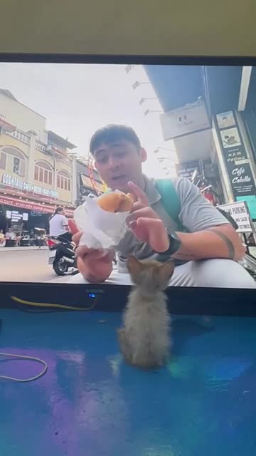 Footage shows the feline named Tralalelo sitting in front of the screen while a tourist sampled a French-style 'banh mi' filled with meat in Vietnam. 2025-06-10 20:52:46