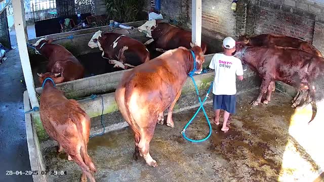 CCTV footage shows the herder hitting the brown bovine on the head with a metal scraper while bathing the cattle in East Java, Indonesia. 2025-06-10 20:52:58