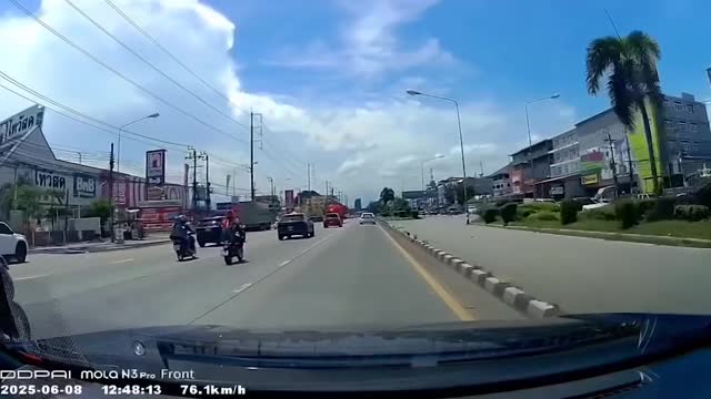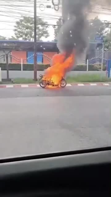 Footage shows the two-wheeler engulfed in flames, with thick black smoke billowing into the air along the motorway in Phuket, Thailand. 2025-06-10 11:48:34