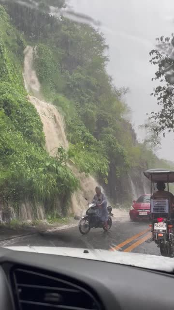 Footage captured by KC Paterno Victor shows motorists navigating through murky waters cascading down from the hill during a downpour on Manila East Road in Cardona, Rizal. 2025-06-10 13:10:32