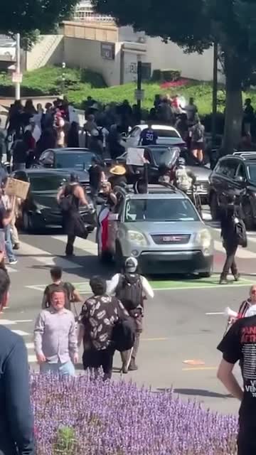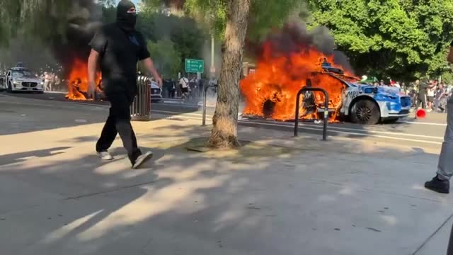 Footage shows the vehicles engulfed in flames, with rioters gathered on the streets on June 8. The suspects also targeted a number of police cars. 2025-06-10 11:25:57