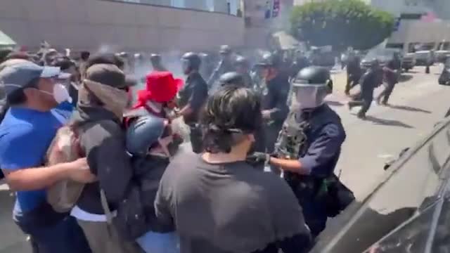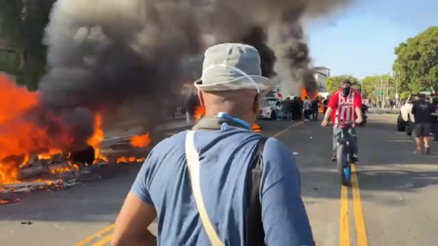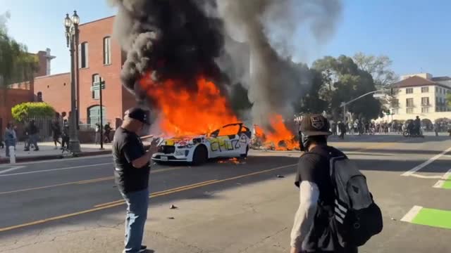 Footage shows the robotaxi engulfed in flames, with a thick plume of smoke rising as demonstrators gathered on the streets on June 8. 2025-06-09 11:33:48