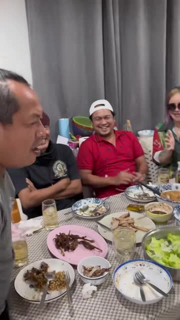 Footage shows the relatives gathered around a restaurant table, playfully mimicking feline sounds to the tune of 'Happy Birthday' in Bangkok, Thailand. 2025-07-14 13:26:39