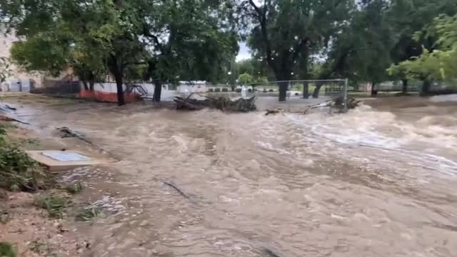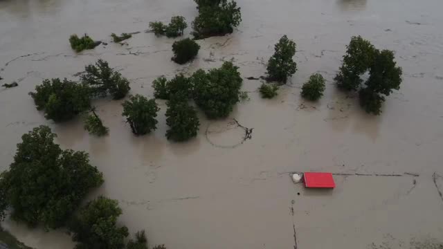 Drone visuals show submerged landscapes, isolated buildings, and a roadway barely visible above the rising waters, as the river swelled dramatically on July 13. 2025-07-14 12:45:53