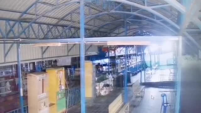 CCTV footage shows the 7ft (2m) python emerging from the side of a container bin as storekeeper Theravit Nocke scrolled through his device in Prachuap Khiri Khan, Thailand. 2025-07-14 13:33:23