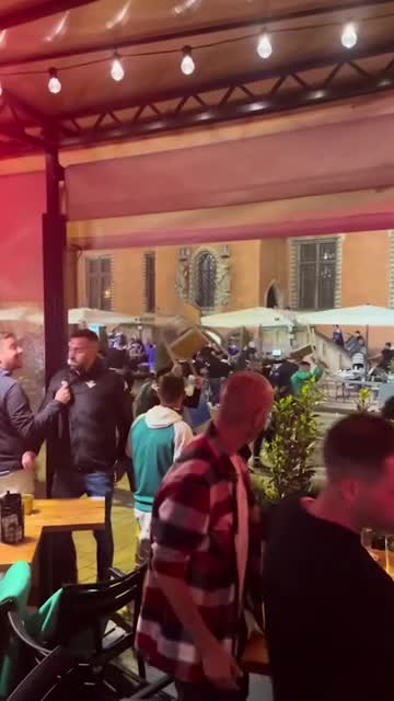 Rival fans hurled chairs, bottles, and flares at each other in Wrocław's main square before the UEFA Conference League final in Wroclaw. 2025-06-04 21:16:43