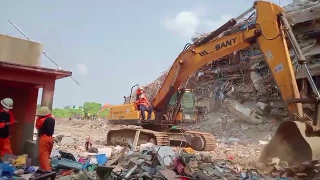 Footage shows emergency services using heavy equipment to lift rubble from the apartment block that was flattened by the tremors in Mandalay on June 3. 2025-06-04 12:55:27