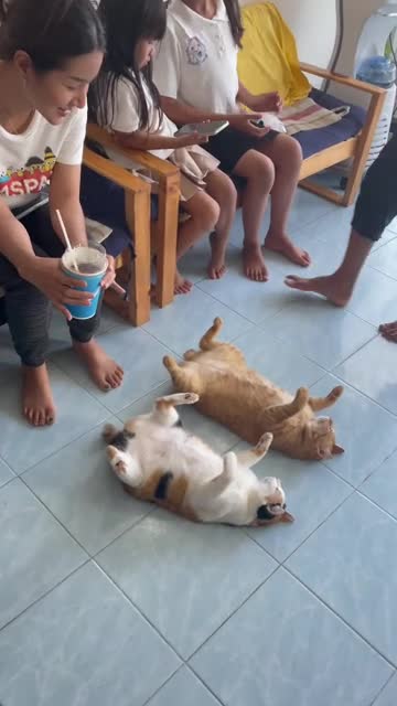 The six-year-old calico named Gigi and her ginger friend, five-year-old Lamyai, were playing together when they suddenly rolled over, facing upwards. 2025-06-04 14:35:54