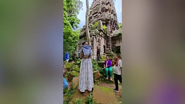 Footage shows the female holidaymaker in a long skirt flashing her blue checkered scarf embroidered with the Cambodian flag as she posed for photos at the Prasat Ta Khwai or Prasat Ta Krabei temple on July 5. 2025-07-09 09:30:32