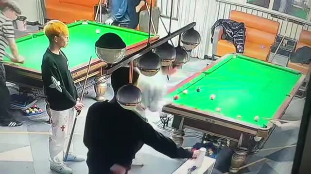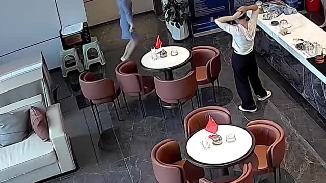 CCTV footage shows the playful teenager bending over and facing the edge of the table with his tongue sticking out in Shandong, China. 2025-12-03 22:22:07