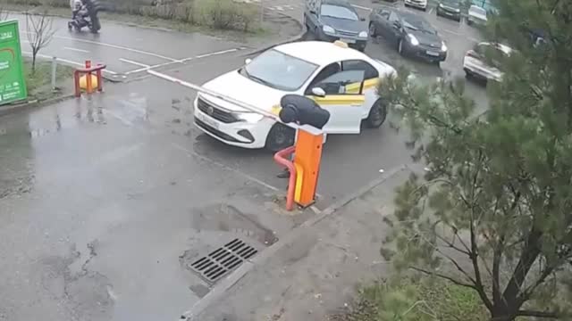 CCTV footage shows the cabbie leaning onto the boom gate to check what was wrong with the mechanism before ripping it off in Krasnogorsk, Russia. 2025-12-04 13:59:57