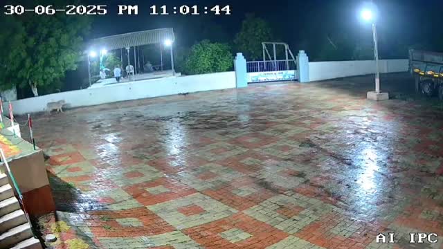 Footage shows the wild feline strolling through the area while the farm owner is seen sitting nearby with companions in Gir Somnath, Gujarat, around 11 pm. 2025-07-07 16:09:47