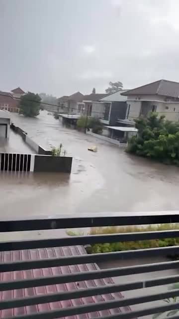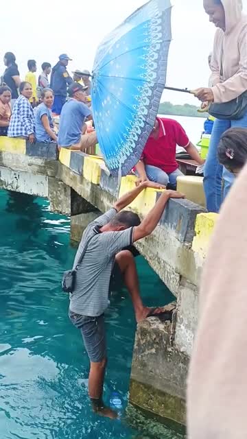 Footage shows the visitor gripping the railing while stretching his right leg toward the floating plastic container in Maluku, Indonesia. 2025-07-07 14:53:08