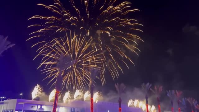 Footage shows a dazzling fireworks display illuminating the evening sky on the eve of the Fourth of July at The Wharf in Orange Beach, Alabama. 2025-07-05 12:32:17