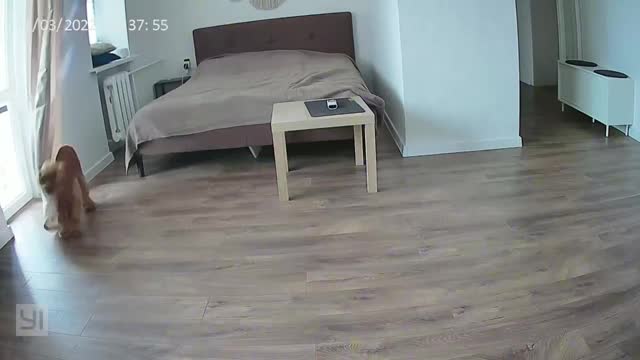 CCTV footage shows the brown poodle biting and pulling the drape before attempting to roll itself up inside the fabric in Brest, Belarus. 2025-07-05 03:00:00