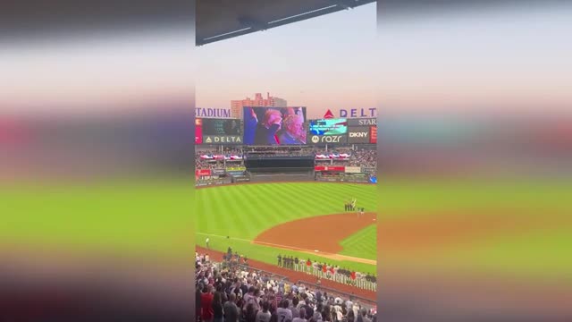 Footage shows spectators reacting as the president appears on the jumbotron, saluting during the national anthem at Yankee Stadium. 2025-09-13 16:39:22