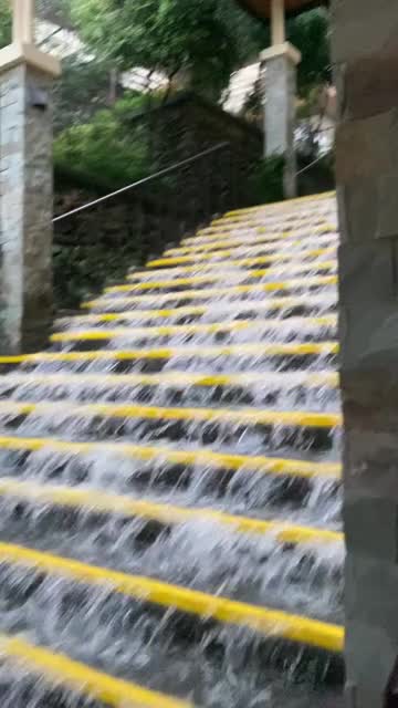 Footage shows water cascading down the staircase while Irene Zacarias made her way up to the ceremony in Benguet province, the Philippines. 2025-07-02 14:03:33