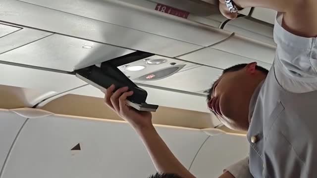 The light fixture, attached underneath the overhead compartment, unexpectedly detached during the journey on a Hainan Airlines flight from Hefei to Chongqing in China. 2025-05-27 17:36:04