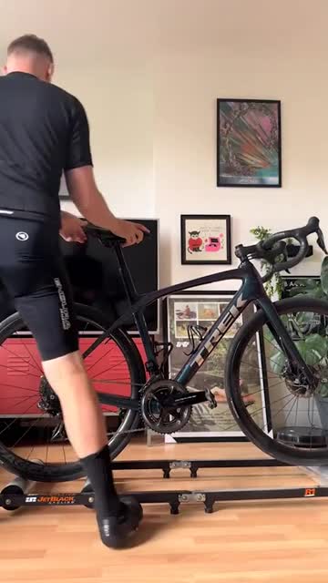 Footage shows the sports lover wearing his outfit indoors while carefully mounting his bicycle on the turbo trainer in his living room in London, United Kingdom. 2025-05-21 14:42:37