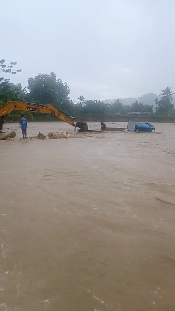 Footage shows the men crawling out of the lorry and scrambling to safety while the vehicle was being secured by an excavator in Sultan Kudarat, the Philippines. 2025-05-21 17:14:36