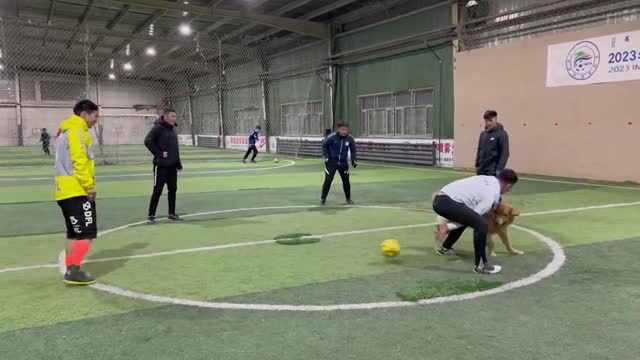Pet dog joins youngsters playing football