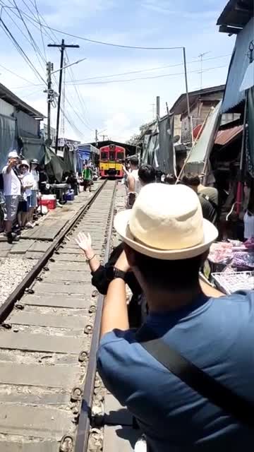 Footage shows a group of holidaymakers standing and recording video as a train departs from the Maeklong Railway Market in Samut Songkhram. 2025-05-19 22:44:08
