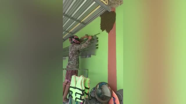 Footage shows the insects gathered on one corner of the wall near the roof while the man put screens on the windows to keep them from flying through in Rayong province, Thailand. 2025-05-17 09:42:26