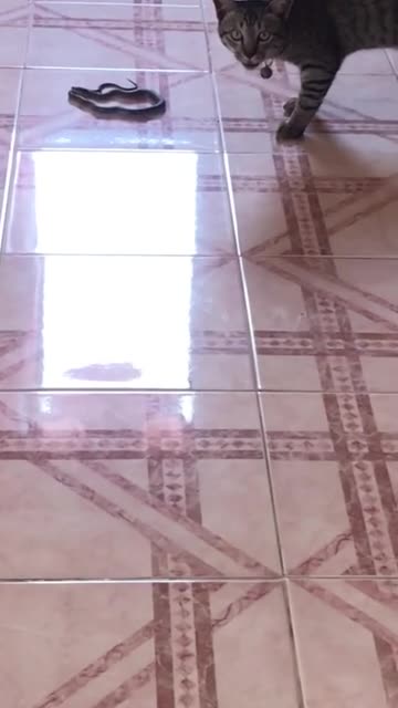 Footage shows the one-year-old moggy named Money calmly approaching the serpent that slithered on the smooth tiled floor in Chiang Rai province, Thailand on September 22. 2025-05-17 09:44:49
