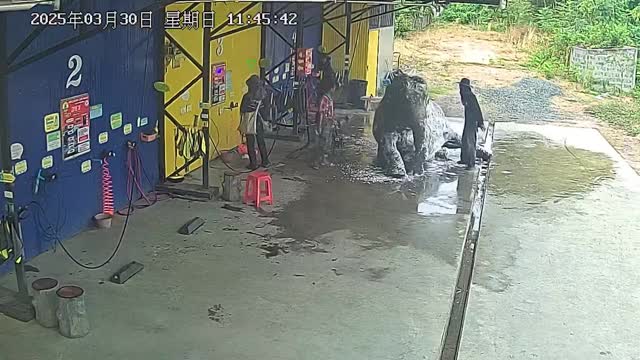 A group of mahouts bathed the pachyderm using the coin-operated auto-cleaning station instead of taking it to a river in Surin province. 2025-06-19 11:34:04