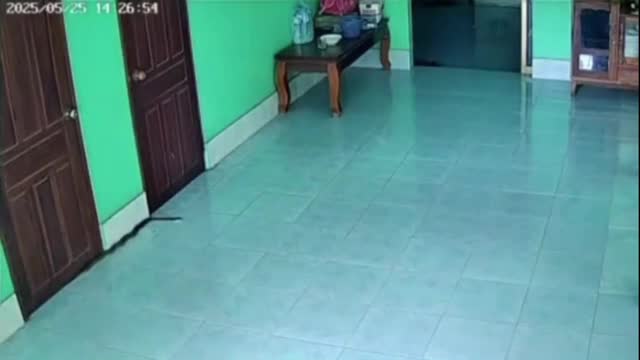 CCTV footage shows the little girl emerging from a bedroom as the 4ft serpent moved just inches from her bare feet in Vientiane, Laos. 2025-06-19 12:44:49