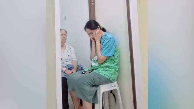 Heartwrenching footage shows Filipino caregiver Jenny Rose covering her ears as she sits beside her pensioner employer in Ramat HaSharon while explosions echo in the background on Saturday, June 14. 2025-06-19 11:33:21