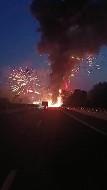 The container truck, loaded with pyrotechnics, caught fire following a collision with another vehicle on the Erguang Expressway in Shanxi.