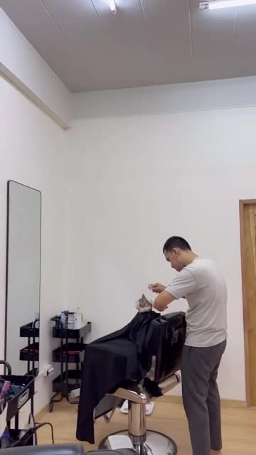 Footage captured by Piyawat Chuoypitak shows the well-behaved white and grey feline wearing eyeglasses while sitting on a chair at a barbershop in Phuket, Thailand. 2025-06-17 13:19:19