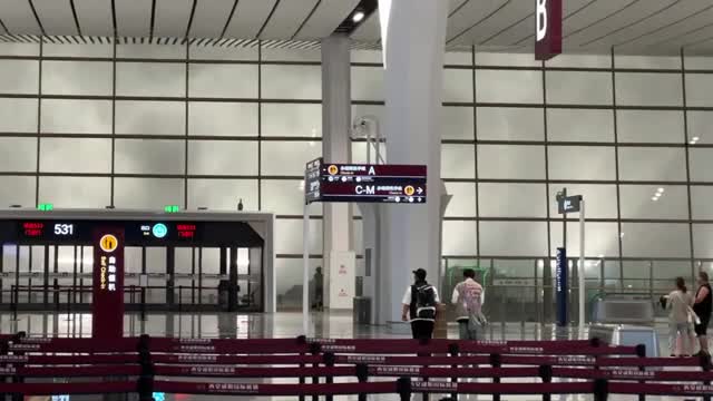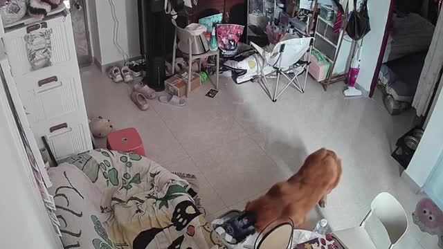 CCTV footage shows the Golden Retriever poking around the bin before accidentally wedging its head into the blue paper bag in a living room in Guangdong, China. 2025-06-17 13:20:14