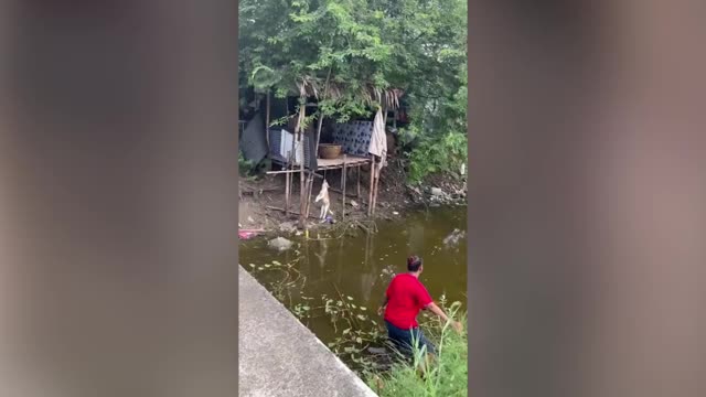 Footage shows the hapless pet pooch suspended from its leash above a murky canal as hero local Anusorn Boonpitak, 38, waded across the filthy water to save it in Nakhon Pathom on Saturday. 2025-06-17 15:32:12
