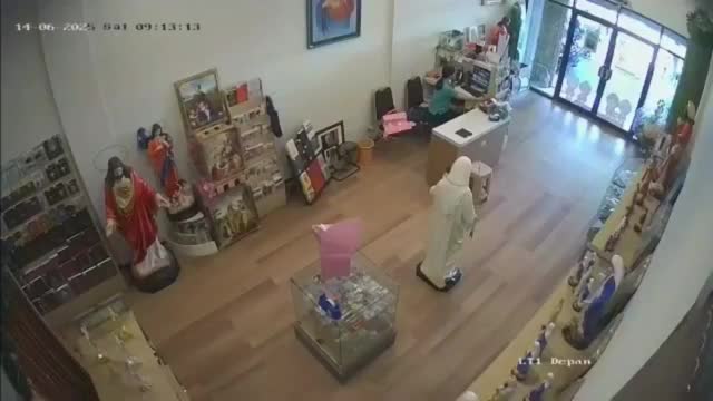 Footage shows a shopkeeper sitting near the entrance of the store in Malang City, East Java, when a speeding vehicle suddenly slammed through the glass door, striking shelves of religious items. 2025-06-17 15:38:56