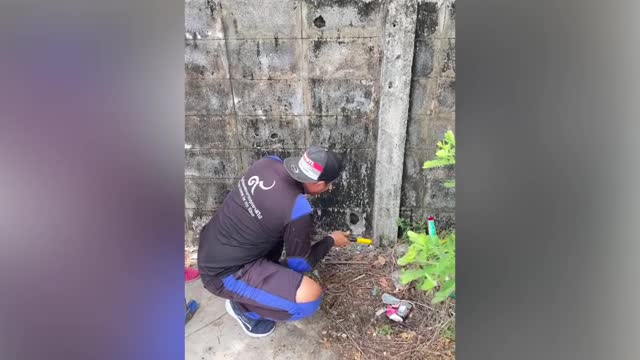 The volunteers were called to the property to help the family free their pooch, who burrowed himself under the small hole while playing but could not come out in Pathum Thani province, Thailand, on May 21.