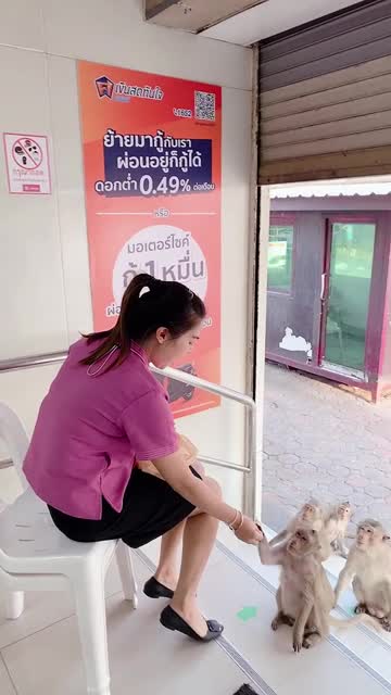 Footage shows the female employee sitting on a plastic monoblock chair, handing out pieces of bread to the primates lining up on the steps in Saraburi, Thailand. 2025-06-16 21:02:24