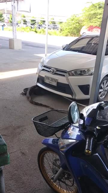 Kanchana Sophasit and his friends discovered the reptile resting beneath the white Toyota sedan in a parking area in Chai Nat, Thailand. 2025-06-16 21:04:29