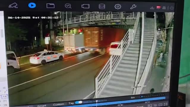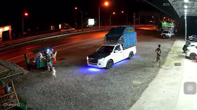 The vendor and three customers sprinted away from the roadside when they saw the speeding vehicle with a burst rear tyre in Chanthaburi, Thailand. 2025-06-16 14:41:04