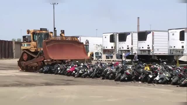 The New York City Police Department destroyed hundreds of illegal two-wheelers in a public demonstration during a demolition derby-style event. 2025-06-14 14:44:16