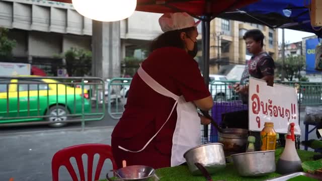 Disabled woman Su Suthisa Inthararak, 30, runs her street food stall, hawking fried worms to customers near the Sports Authority of Thailand Market in Bangkok, Thailand. 2025-06-14 14:11:45