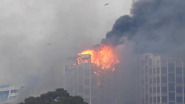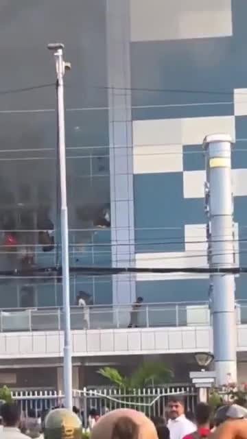 Dramatic footage shows workers leaping from shattered glass windows of a building set on fire by protesters, as thick smoke engulfs the structure in Kathmandu on September 9. 2025-09-10 12:42:18